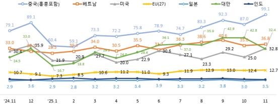 지역별로는 중국(홍콩 포함)이 99.1억 달러로 25.3% 늘며 반도체(75.1억 달러, 31.8% 증가) 중심의 증가세를 나타냈다. 베트남은 36.8억 달러로 11.6% 늘었고, 미국도 32.8억 달러로 7.9% 증가했다. 유럽연합은 12.7억 달러로 18.1% 증가했으며, 대만은 32.4억 달러로 32.2% 늘었다. 일본은 3.5억 달러로 18.0% 증가하며 증가세로 전환했지만, 인도는 4.1억 달러로 8.9% 감소했다.