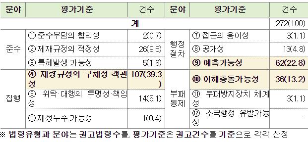 부패영향평가는 법령·제도의 입안 단계에서 불명확한 규정이나 과도한 재량이 부패를 초래할 가능성을 사전에 분석·정비하는 제도다. 이번 평가에서 행정청의 재량권 남용이 우려되는 규정이 107건(39.3%)으로 가장 많았으며, 행정의 예측가능성이 미흡한 규정(62건, 22.8%), 이해충돌 가능성이 있는 규정(36건, 13.2%)이 뒤를 이었다.