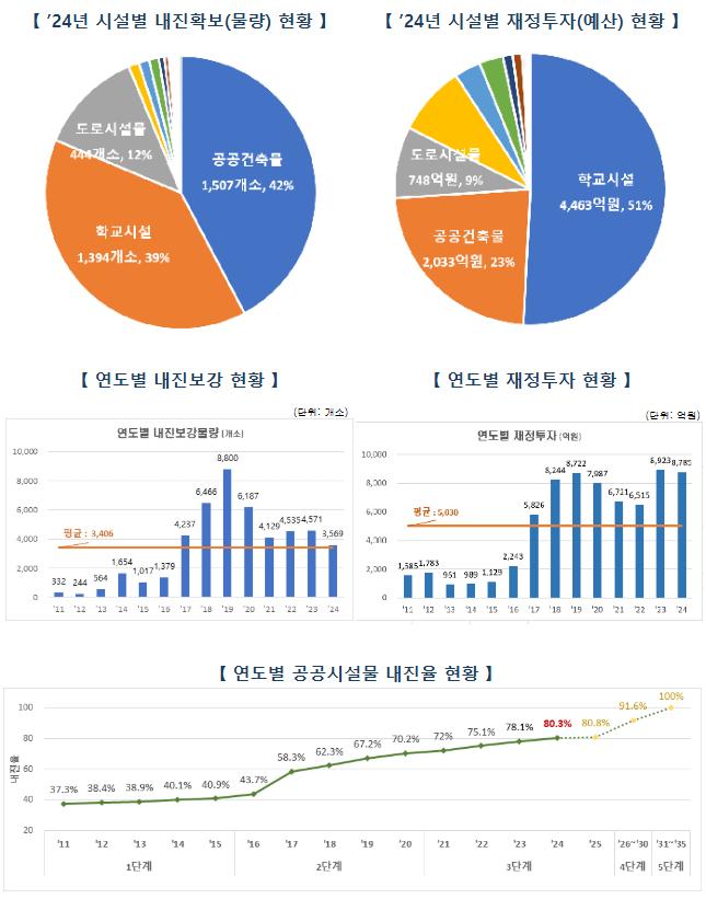 2023년 한 해 동안 중앙부처와 지방자치단체는 총 8,785억 원의 예산을 투입해 3,569개 시설에 대한 내진보강을 실시했다. 분야별로는 공공건축물이 1,507개소(2,033억 원)로 가장 많았고, 이어 학교시설 1,394개소(4,463억 원), 도로시설물 444개소(748억 원) 순이었다.
